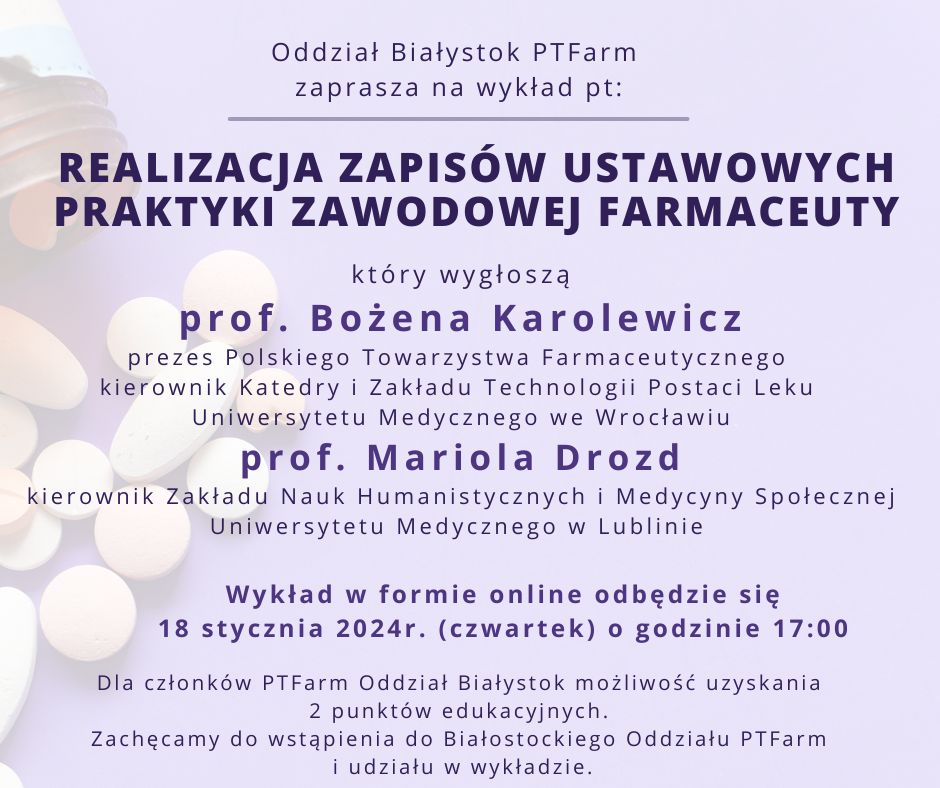 W imieniu Zarządu Białostockiego Oddziału PTFar. serdecznie zapraszamy na wykład pt.: „Realizacja zapisów ustawowych praktyki zawodowej farmaceuty", który wygłoszą prof. Bożena Karolewicz, prezes PTFarm. oraz prof. Mariola Drozd. Wykład w formie online odbędzie się w dniu 18 stycznia 2024 r. o godz. 17:00 na platformie ClickMeeting. Zaproszenie Link do rejestracji