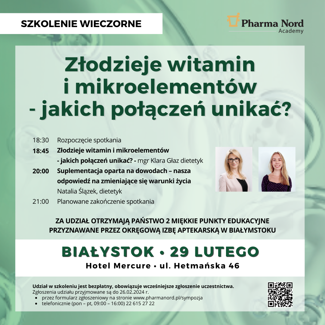 Złodzieje witamin i mikroelementów - jakich połączeń unikać? - szkolenie stacjonarne 29 lutego 2024 r., godz. 18.30; Białystok, hotel Mercure, ul. Hetmańska 46